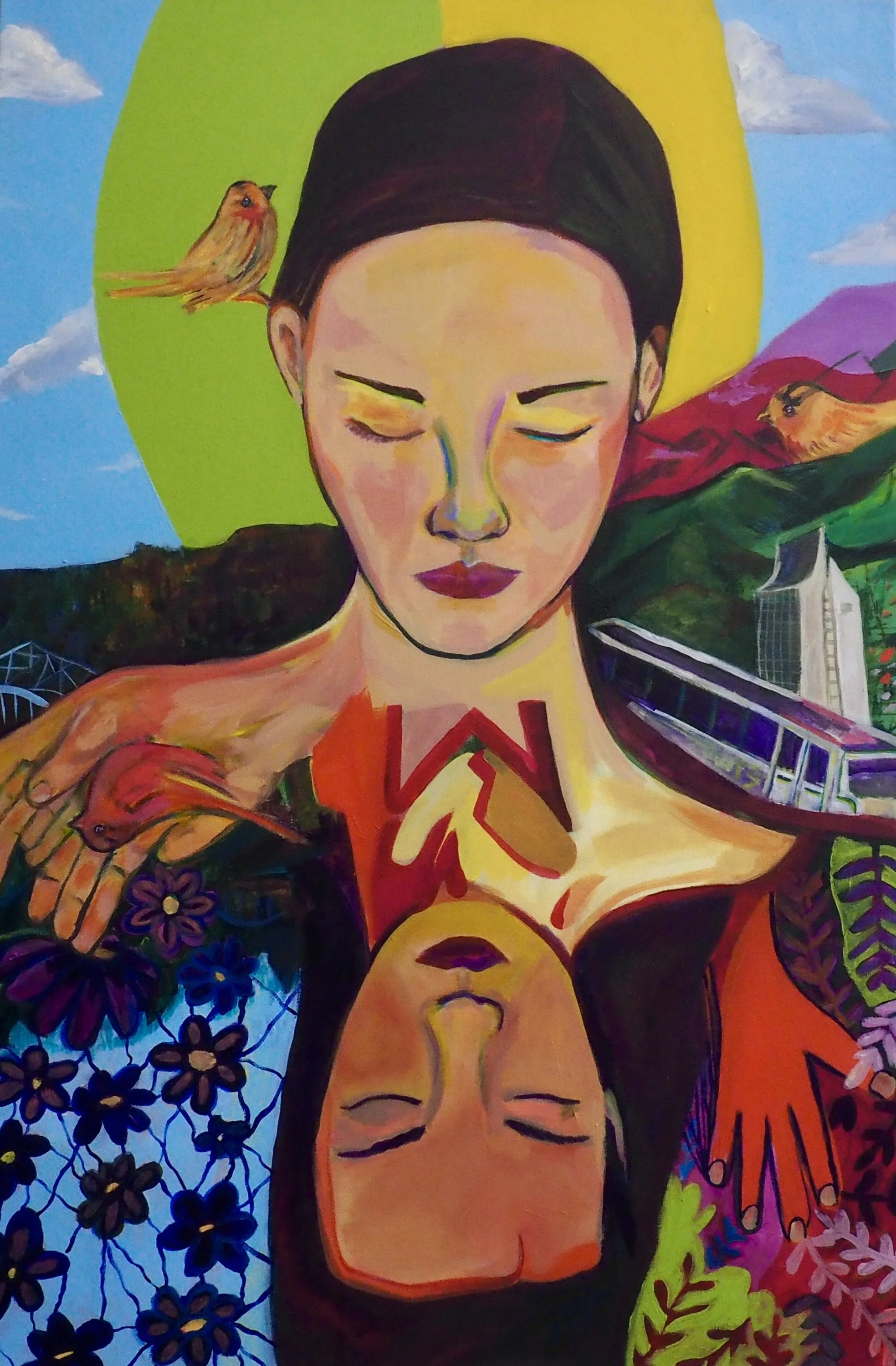 Juliet Maya is a Colombian-born artist based in La Crosse, Wisconsin. Her work explores the transmutation of emotions, interpersonal relationships, and the profound connection between human beings and the nature. Maya’s practice frequently engages with themes of motherhood and its social burdens, examining these experiences across generations and within global contexts. Working across painting, drawing, and textile processes, she uses material and gesture as tools for exploration and expression. Informed by her professional background in marketing and communications, Maya brings a strong awareness of visual language, narrative, and audience engagement to her artistic practice. She is also a mom, loves to go on walks and eating ice cream.